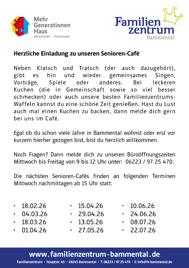 In entspannter Atmosphäre bei Kaffee, Tee und selbst gebackenem Kuchen können Sie alte Bekannte treffen und neue Kontakte knüpfen. Egal, ob Sie zum Reden, Lachen oder einfach nur zum Dabeisein hier sind – bei uns ist jede*r willkommen!