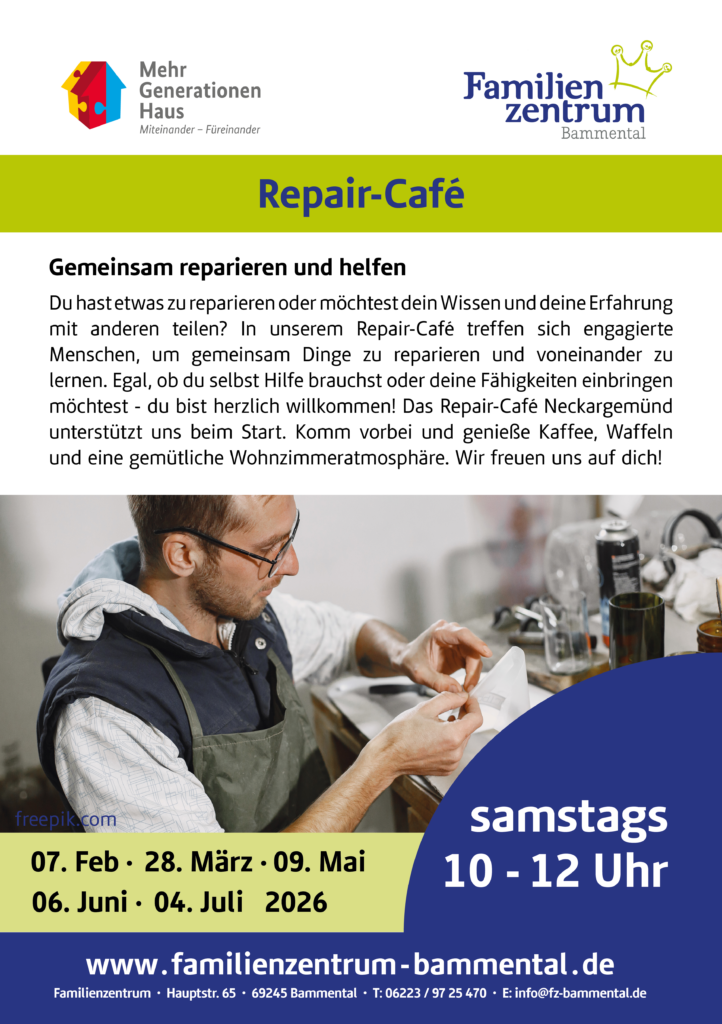 Einmal im Monat (2026) verwandelt sich das Familienzentrum Bammental in eine fröhliche Werkstatt voller Schraubenzieher, Nähmaschinen, Kaffeetassen und guter Laune. ☕🔧🧵