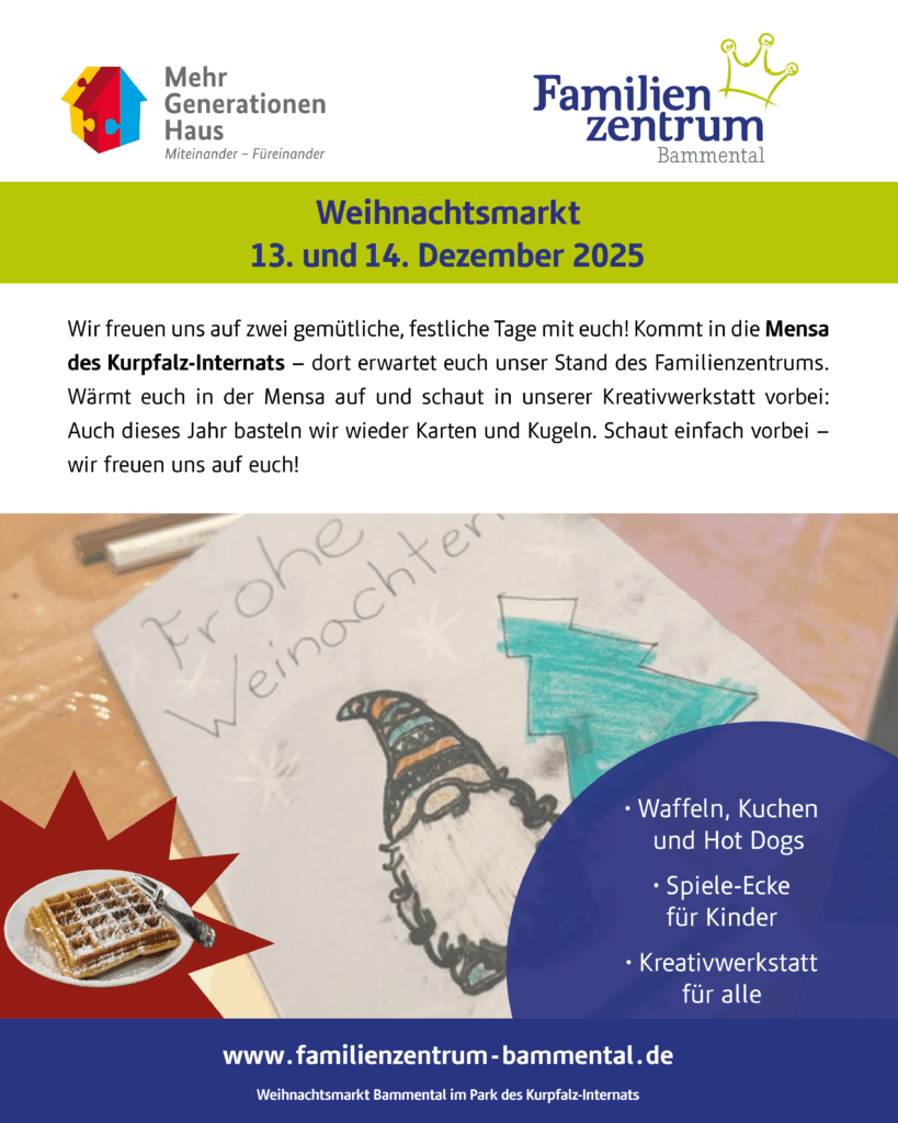 Am 13. und 14. Dezember 2025 lädt der Weihnachtsmarkt in Bammental wieder zu einem stimmungsvollen Fest für die ganze Familie ein. Im Park des Kurpfalz Internats und in der Mensa erwartet dich ein abwechslungsreiches Programm, das Herz und Sinne wärmt.